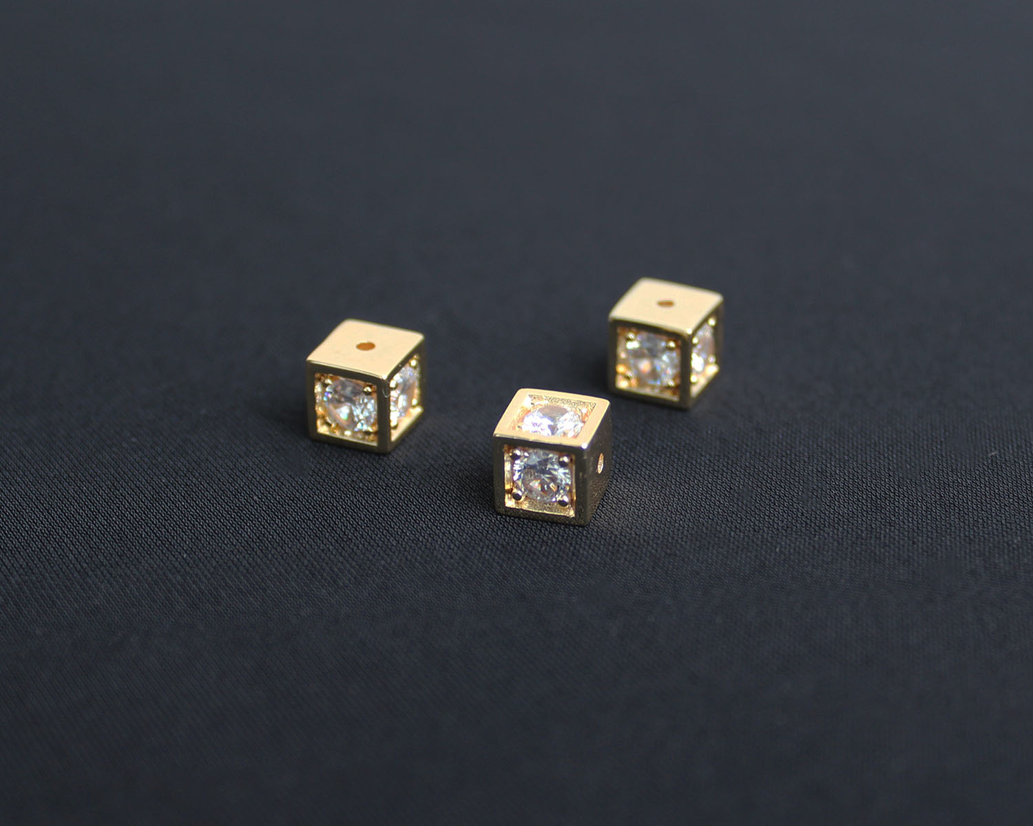 Бусина-кубик инкрустированная цирконами /куб, позолоченная, 6.5*7 мм/