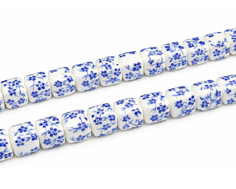Бусина керамическая с синими цветочками /куб, 8 мм/