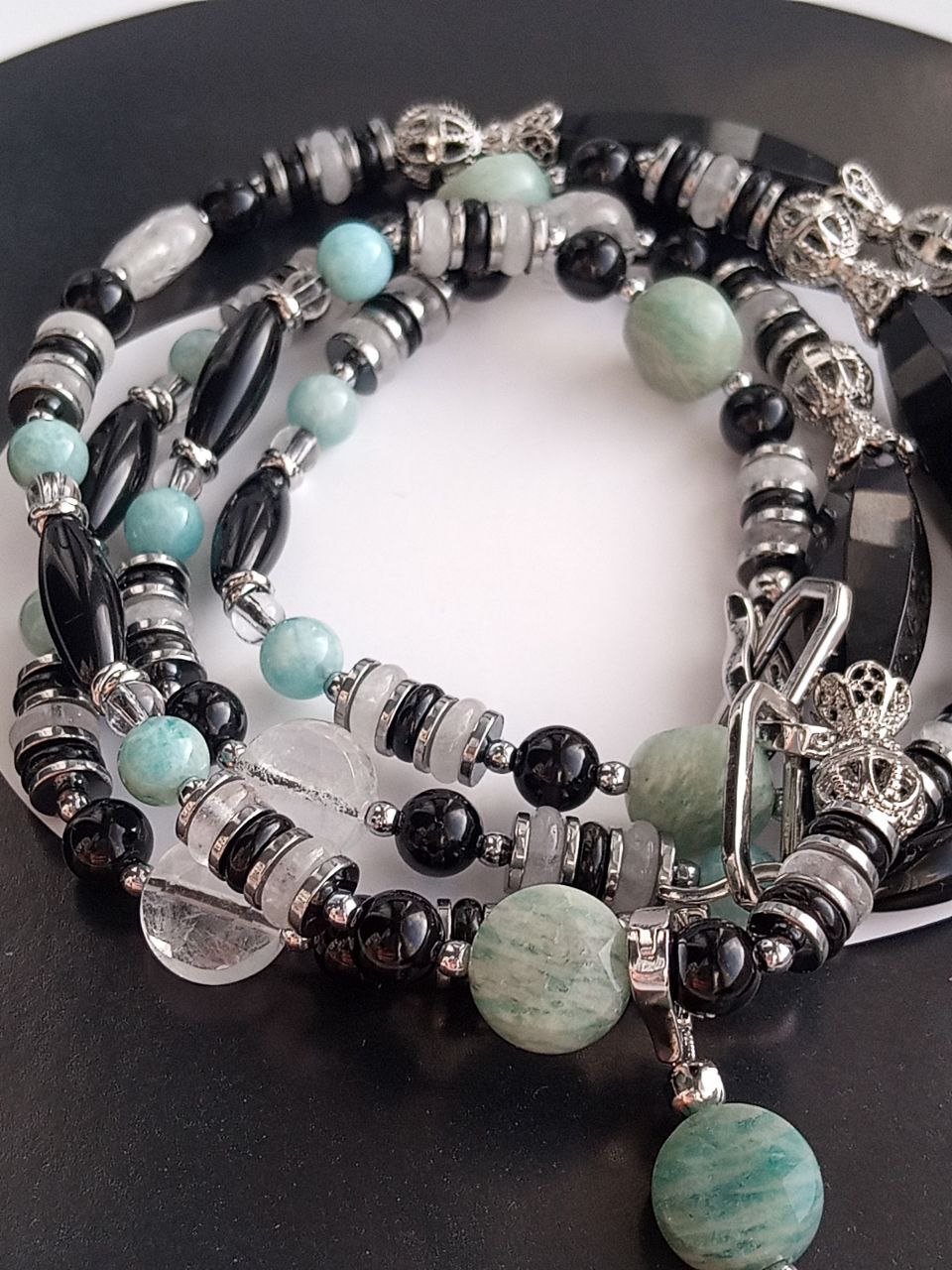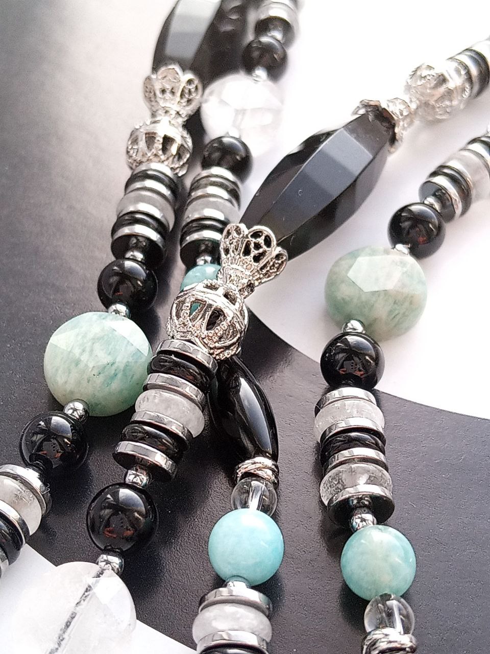 Бусины разной формы: шарики, рондели, гранёные таблетки и удлинённые гранёные бусины — создают ритм и живую фактуру.