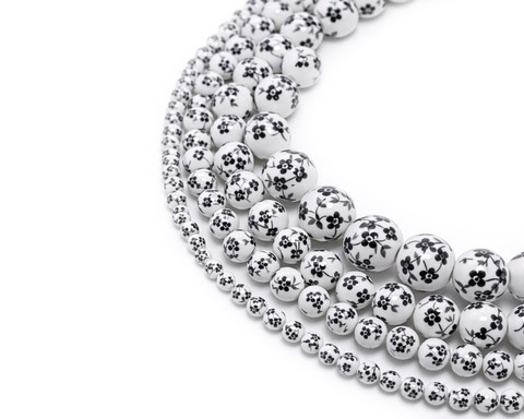 Бусина керамическая с черными цветочками /шарик, 8 мм/
