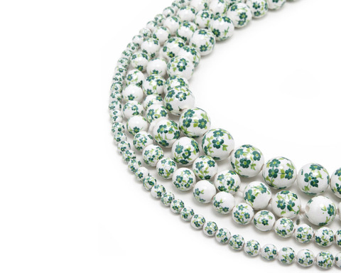 Бусина керамическая с зелеными цветочками /шарик, 10 мм/