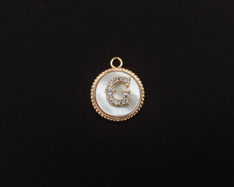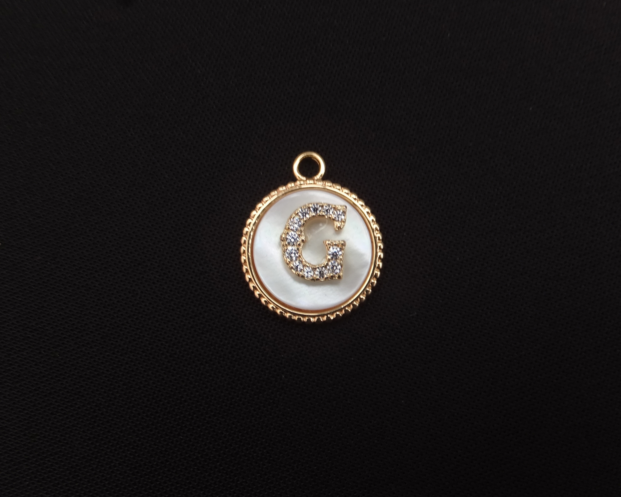 Подвеска "Буква G" инкрустированная фианитами с перламутром /позолоченная, 14 мм/