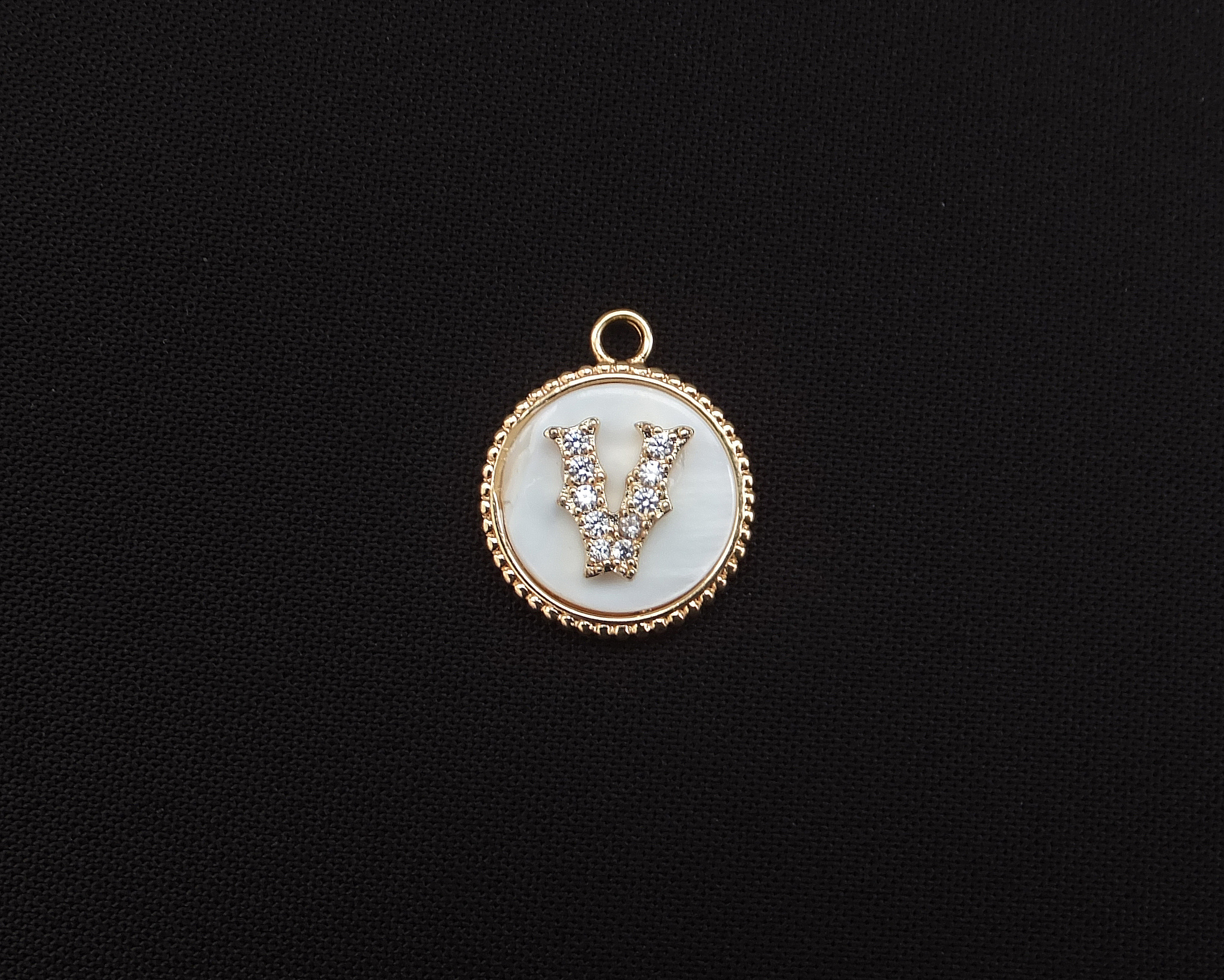 Подвеска "Буква V" инкрустированная фианитами с перламутром /позолоченная, 14 мм/