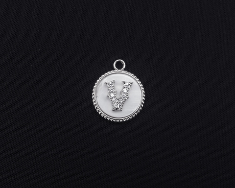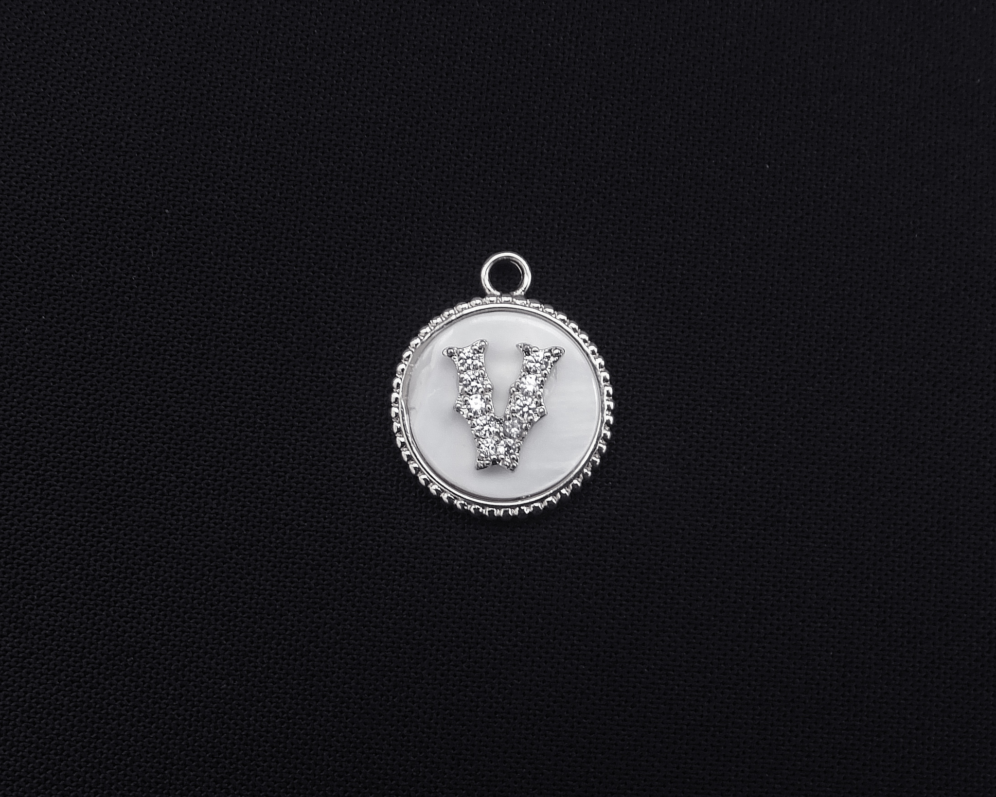 Подвеска "Буква V" инкрустированная фианитами с перламутром /родированная, 14 мм/